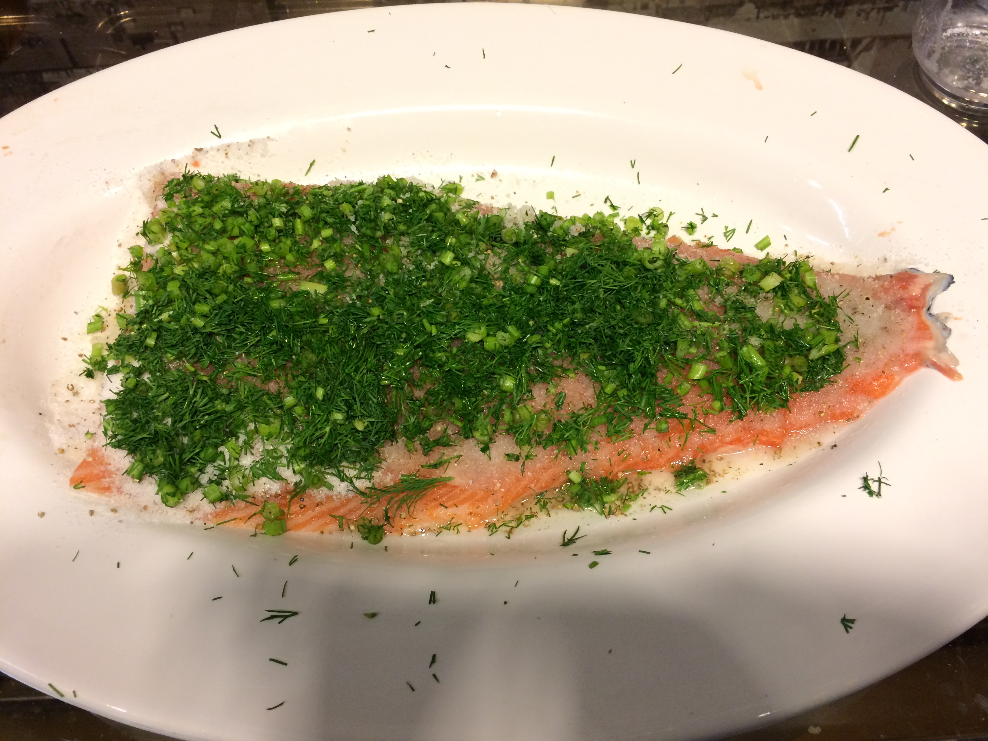 Eine Hälfte ist in Salzlake, zum Räuchern. Die zweite Seite, halbiert, wird mit Dill mariniert. Ein altes schwedisches Rezept, ist auch seit unserer Zeit in Skandinavien in unserem Repertoire. Der Lachs wird mit Salz, Zucker und weißem Pfeffer eingerieben und mit Gin begossen. Dann wird das Ganze mit gehacktem Dill abgedeckt, Folie darüber, ein Holzbrett oder eine schwere Platte darauf und mit allem beschwert, was so in den Kühlschrank passt. 3 Tage ziehen lassen. Eigentlich wird er ja im Boden vergraben, dewegen gravad… Aber unsere Nachbarskatzen hätten sicherlich große Freude daran. Aufschneiden und genießen……
