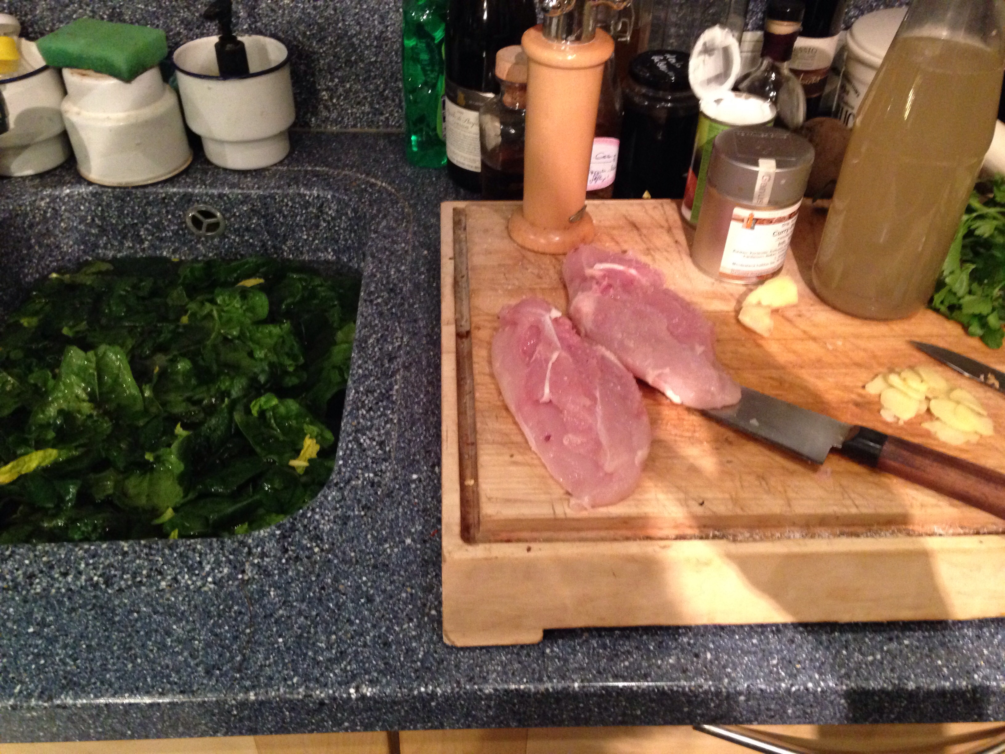 Spinat zerpflücken und waschen. Ingwer abschaben und die Hälfte in feine Scheiben schneiden.