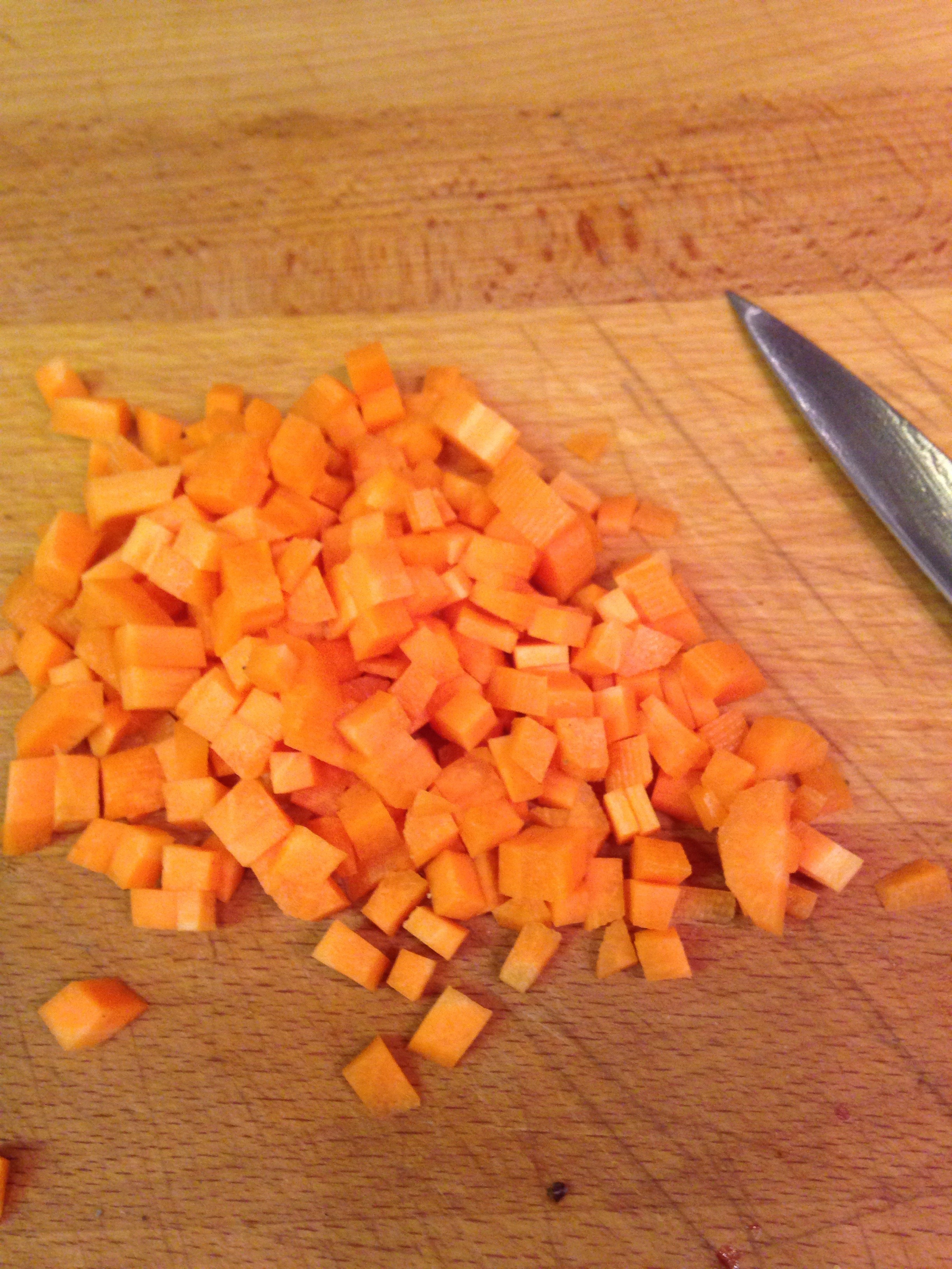 Die Linsen in 1/2 l Wasser weichkochen. Dauert etwa 40 Minuten. Die Möhre klein würfeln und in der letzten Viertelstunde zu den Linsen geben.