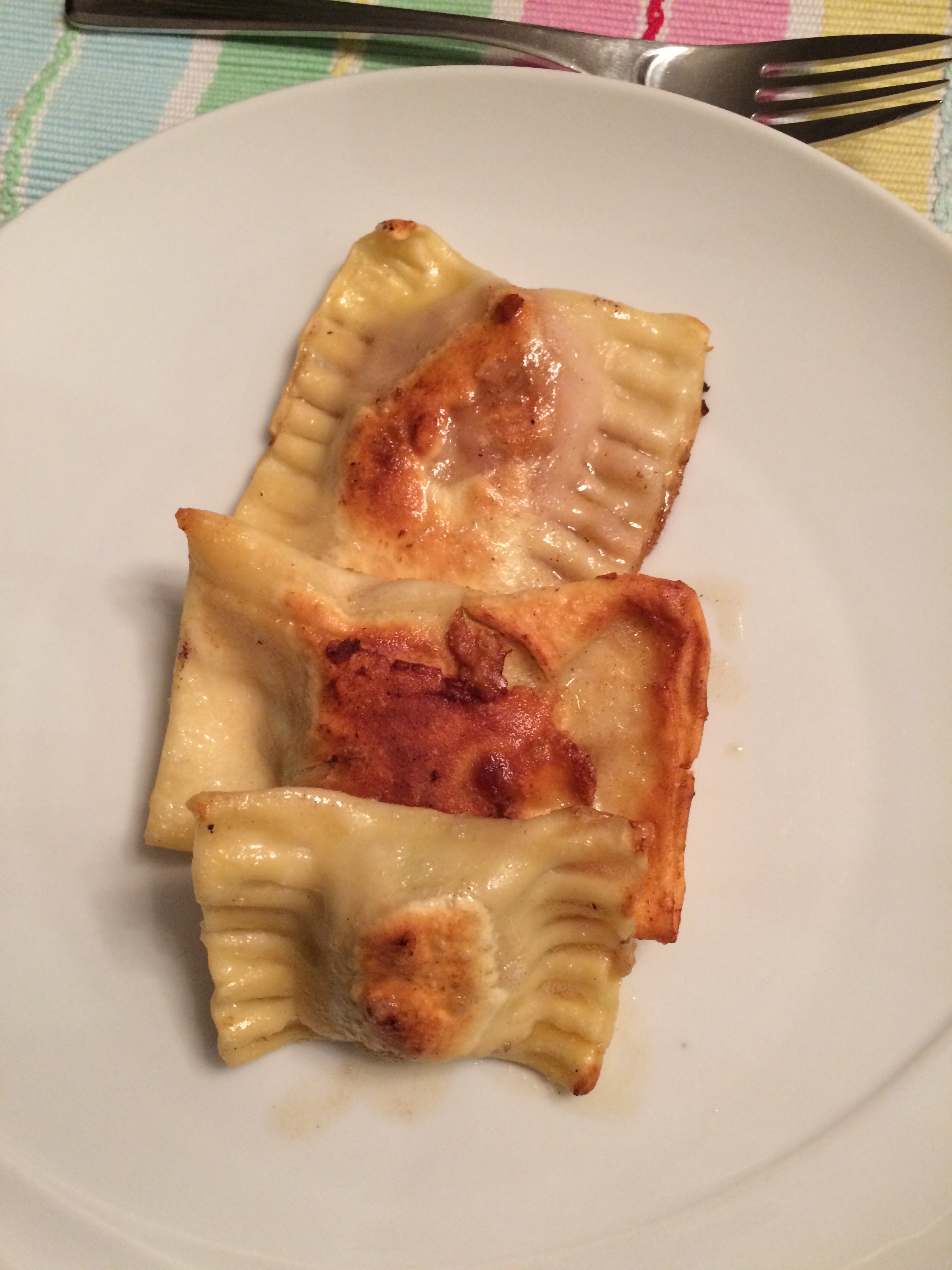 Den Nudelteig mit der Nudelmaschine ausrollen. Einen Streifen von etwa 40 cm Länge abschneiden und der Länge nach je einen Esslöffel Füllung mit gutem Abstand auf die Nudelbahn legen. Den Rand und die Zwischenräume mit verkleppertem Ei bestreichen und über die Füllung schlagen. Die Zwischenräume gut andrücken. Die Maultaschen voneinander trennen und in siedendem, gesalzenem Wasser ziehen lassen. In einer Pfanne mit Butter anschmelzen.