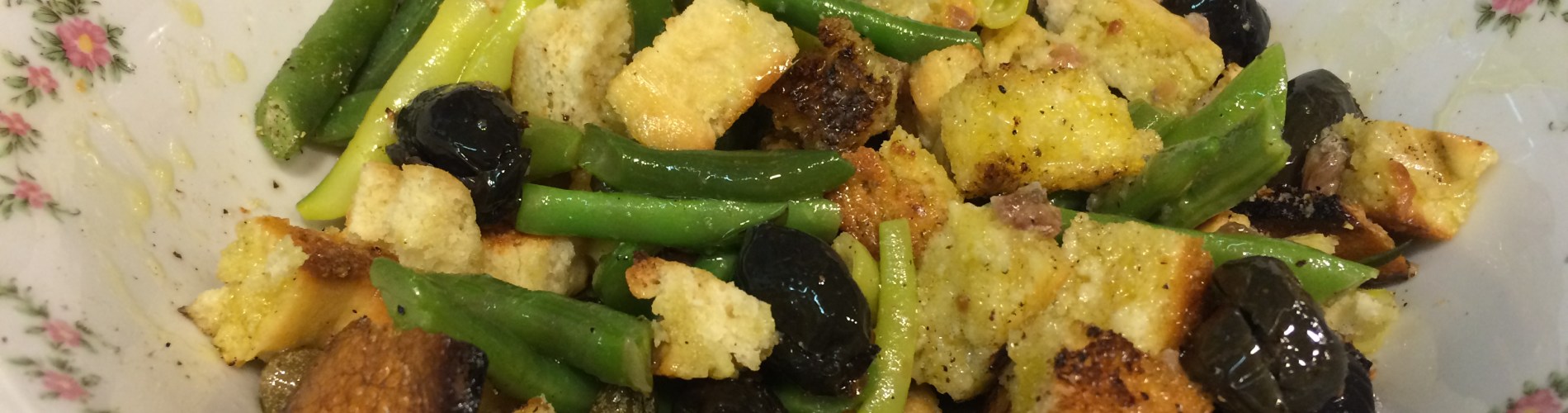Die Bohnen in kochendem Wasser mit einem Zweig Bohnenkraut kochen und abgießen. Das Brot toasten, mit der Knoblauchzehe abreiben und in Würfel schneiden. Die Oliven entkernen. Die Kapern in Wasser legen und entsalzen. Die Sardellenfilets hacken und mit Olivenöl und Essig verrühren. Alles gut vermischen und bis zum Servieren kalt stellen.