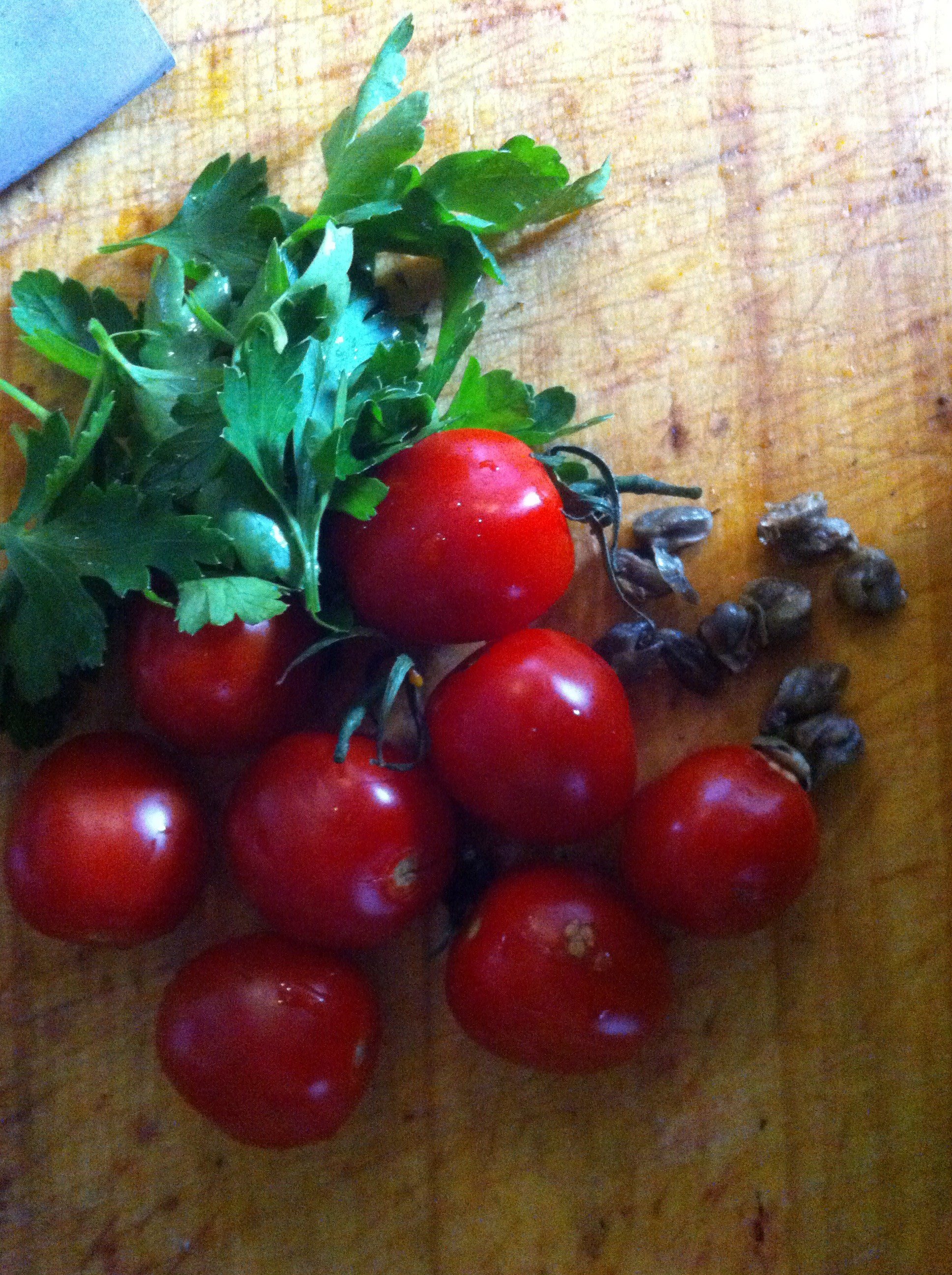 Die Cocktailtomaten in einer Pfanne bei mittlerer Hitze in heißem Olivenöl anbraten, fein gehackten Chili zugeben und etwa 8 Minuten braten, immer wieder an der Pfanne rütteln, dass die Tomaten sich drehen. Kapern zugeben, leicht salzen und die Petersilienblätter zugeben.