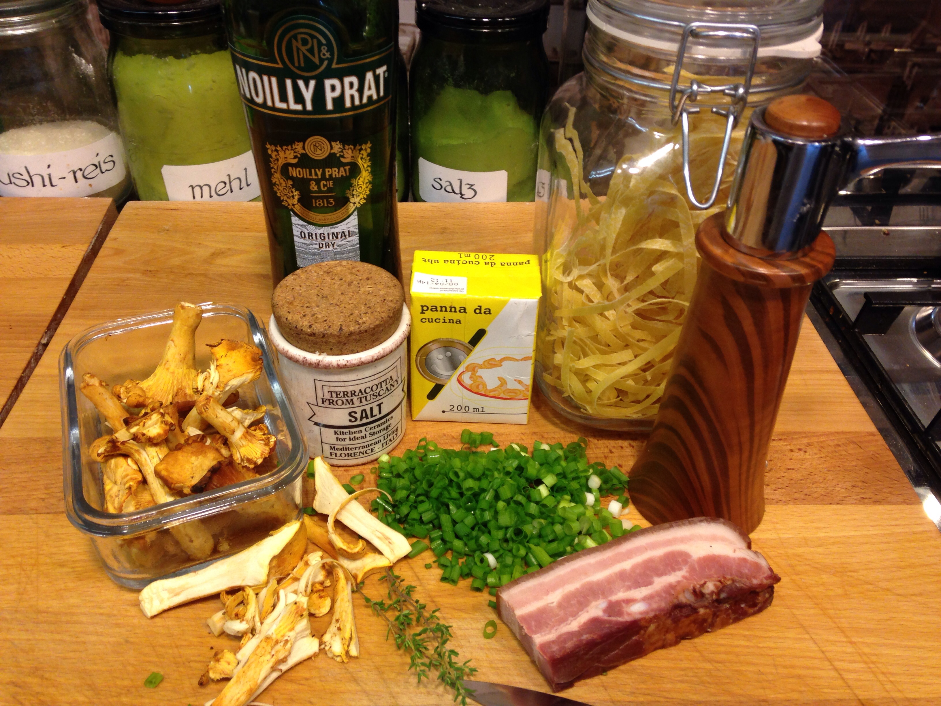 Pfifferlinge putzen und je nach Größe, halbieren oder vierteln. Lauchzwiebeln in feine Ringe schneiden. Thymian waschen, trockenschütteln und die Blättchen von den Stielen streifen. Nudelwasser zum Kochen bringen und salzen. Speck in der Pfanne anbraten, die Pfifferlinge zugeben und ca. 5 Minuten unter Wenden braten, Frühlingszwiebeln zugeben und mit Noilly Prat ablöschen. Den Wermut einkochen lassen , Sahne angießen und aufkochen. Mit Salz, Pfeffer und Thymian würzen. Die gekochten Tagliatelle unter die Pfifferlingssahne heben und sofort servieren. Dazu ein schönes Glas Weißwein…..